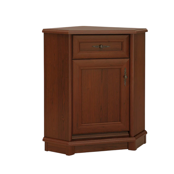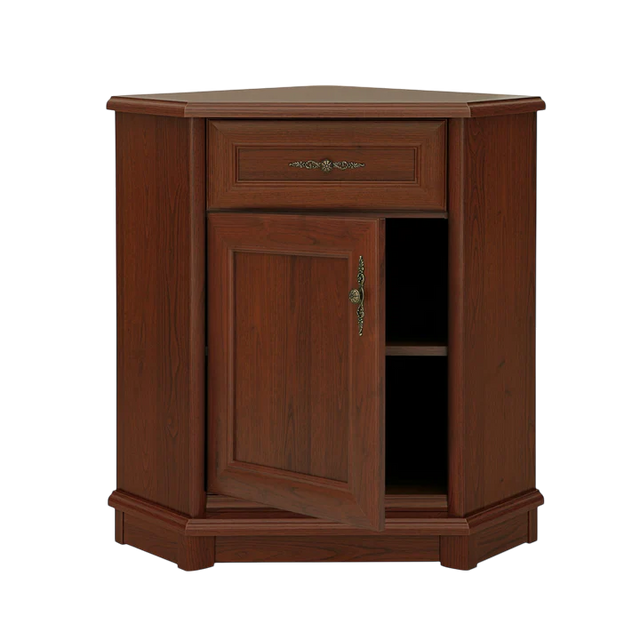 Comoda de colt Kent da o nota aristocratica intregii colectii de mobila clasica Kent si impresioneaza prinfinisajele, soclurile si fronturile sculptate, manerele subtile, marginile frezate si sticla vitrinelor. Spațiul practic de depozitare este creat de un raft intern și un sertar practic care poate găzdui accesoriile necesare.