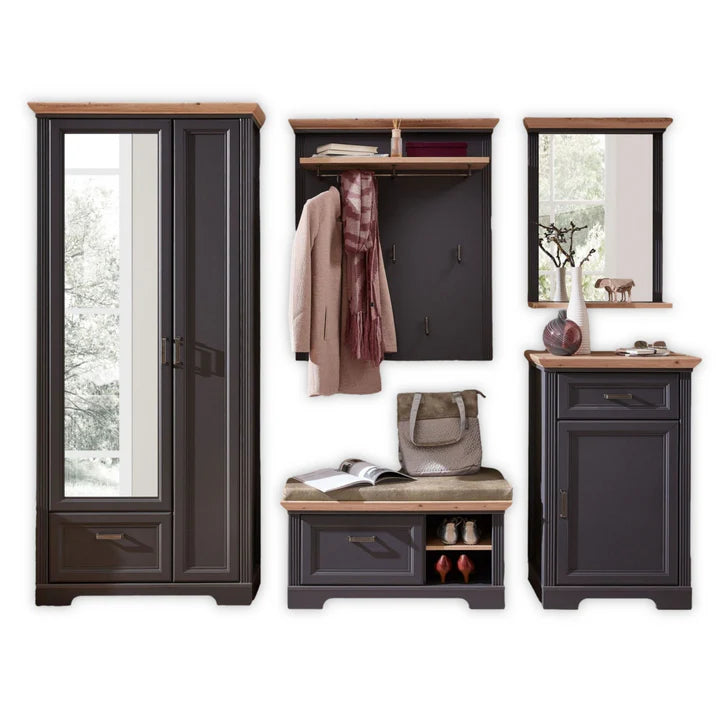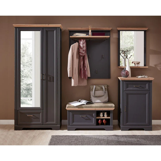 SET MOBILIER PENTRU HOL JASMIN 2, GRI GRAFIT/STEJAR ARTISAN, PAL, FORMAT DIN: CUIER, OGLINDA, PANTOFAR, COMODA SI DULAP