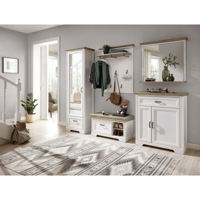 SET MOBILIER PENTRU HOL JASMIN, ALB/STEJAR ARTISAN, PAL, FORMAT DIN: CUIER, OGLINDA, PANTOFAR, COMODA SI DULAP